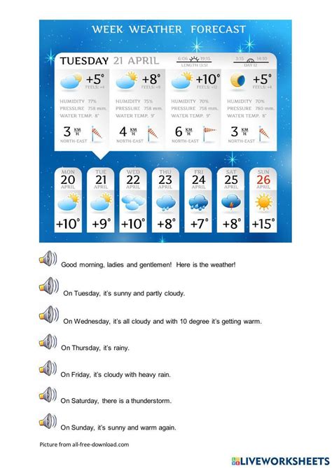 Weather Forecast Worksheet. Mon tue wed thu fri sat sun 78 74 68 61 53 65 72 what will the. Free interactive exercises to practice online or download as pdf to print.