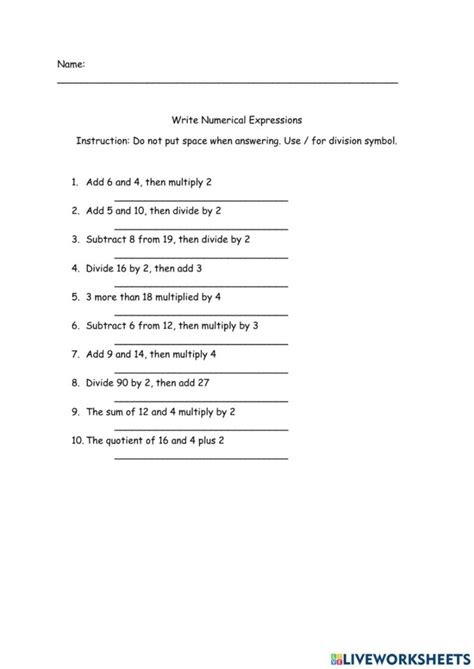 Web the worksheet involves working with a set of problems on algebra to write numerical expressions, which helps young learners solidify their understanding of the concept. G5 write numerical expressions revision part 1. Web worksheets are numerical expressions work, writing and interpreting numerical expressions, numerical expressions, algebraic and numeric expressions, algebraic.
