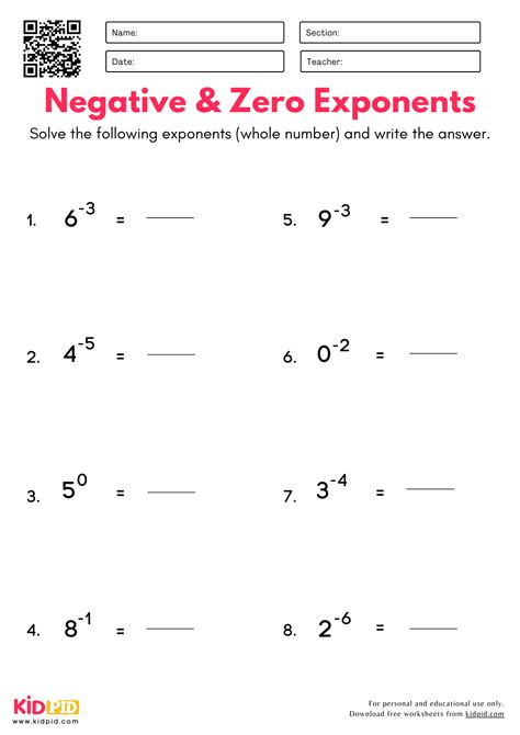 Web a negative exponent simply means that the base is on the wrong side of the fraction line,so you need to flip the base to the other side. Grade 6 exponents worksheet keywords: Your answer should contain only positive exponents.